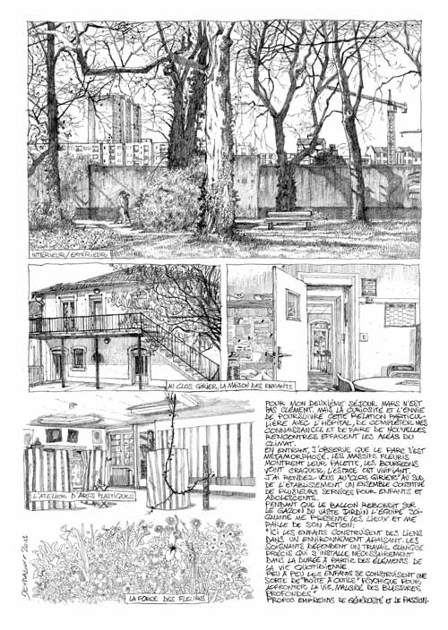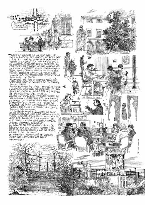 Partageant lors de ses séjours quelques instants de vie avec des patients, des résidents, des habitants, des professionnels, il s’est laissé doucement apprivoiser par ce territoire étrange et étranger. De retour à l’atelier, c’est à partir de ces bribes de présents rassemblés qu’il devient passeur : composant un récit sans histoire, une représentation cohérente construite de « briques » de vérité, d’images, de mots et de phrases entendues. De cette vision éphémère sourd une dimension poétique, colorée par une sensibilité mélancolique. Elle s’accorde au territoire et au sujet abordé : un quartier « de passages » en perpétuel devenir, un hôpital psychiatrique, des hommes et des femmes en mouvement, arpentant, ici comme ailleurs, l’espace et le temps.