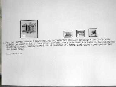Ce sont elles qui, patientes, trompant par leur fausse immobilité, ont attiré l’œil, tiré les lignes, et retiré les vues de l’indifférence du monde. Ainsi des centaines d’images, à peine fixées par un commentaire laconique répondent à l’œil qui les observe, aux mains qui suivent cet œil, et à nos yeux qui ont pris la place du dessinateur.